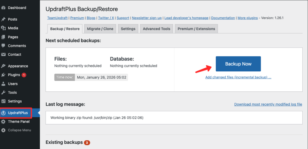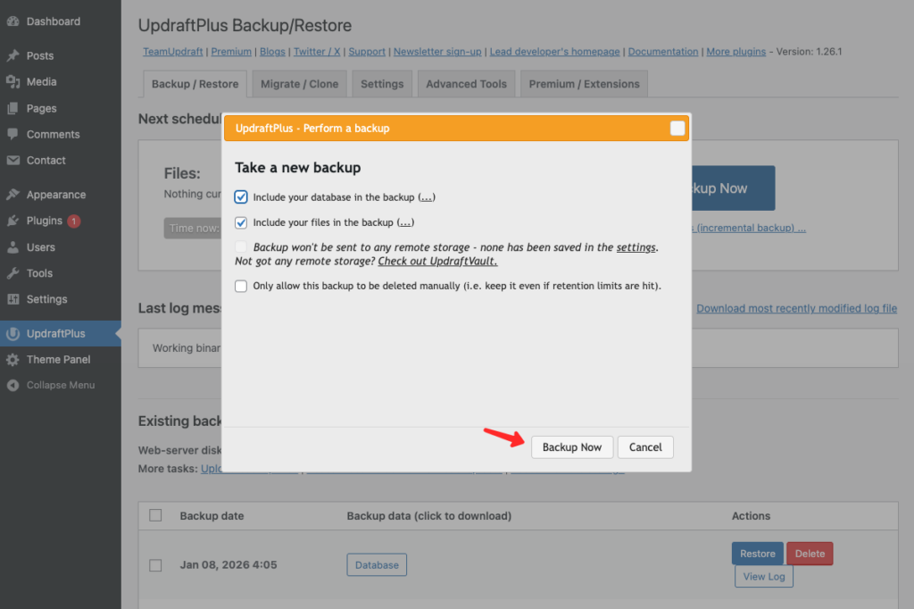 - Masuk ke wp-admin → UpdraftPlus