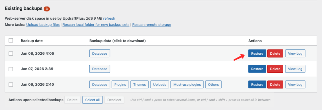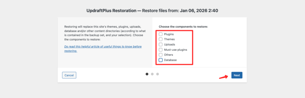 - Pilih data yang ingin direstore (database, plugin, theme, uploads, dll)