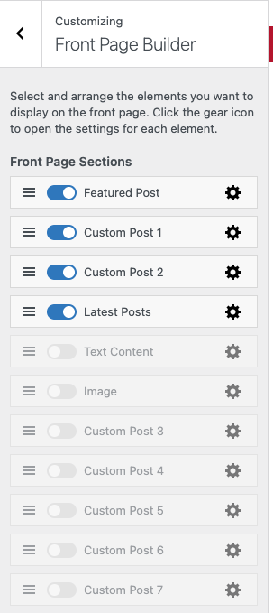 - Akses melalui wp-admin > appearance > customizer, lalu klik front page builder.