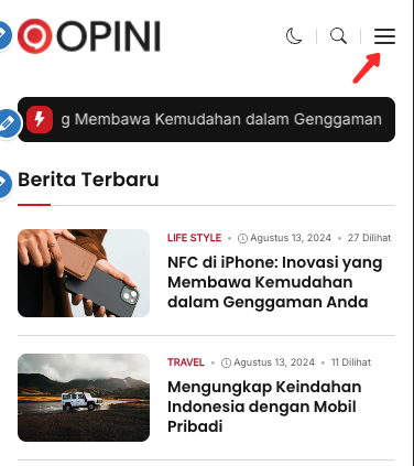 Secara default, tampilan menu pada perangkat mobile menggunakan mode geser ke samping. Selain gaya tersebut, Anda dapat menggunakan model menu off-canvas sidebar. Dimana dibagian header mobile akan ditampilkan toggle untuk membuka semua menu dalam mode canvas.