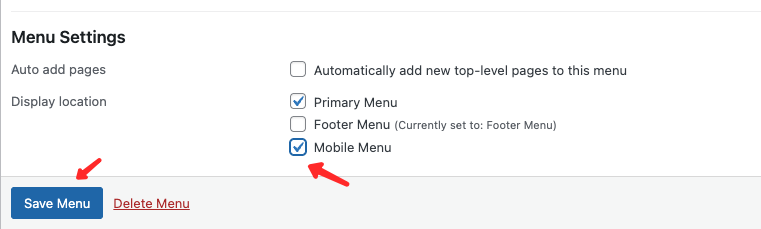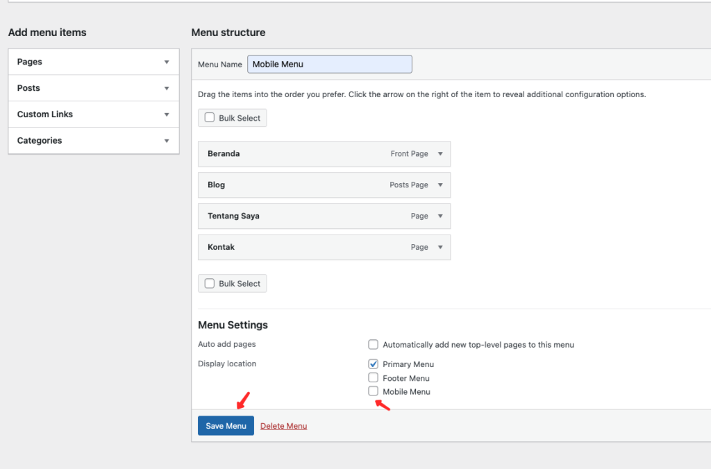 3. Pada bagian Menu Settings, centang lokasi Mobile Menu